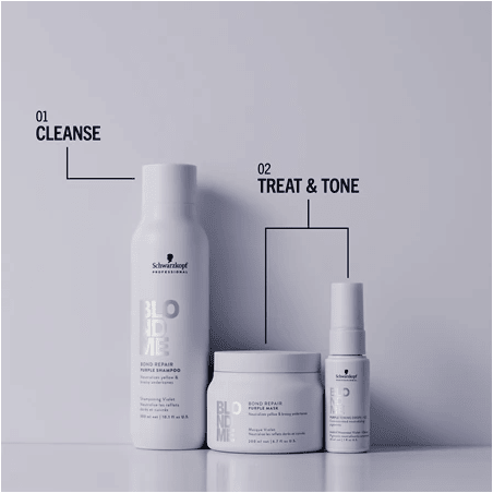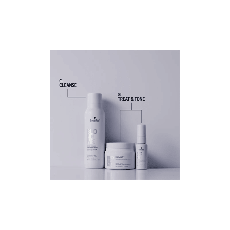El champú morado Bond Repair elimina los tonos cálidos o amarillos en rubios fríos y polares, manteniendo la dirección tonal deseada sin alterar el color. Además, fortalece la fibra capilar, reduciendo la rotura y reparando daños para un cabello más resistente. Consigue un rubio vibrante, brillante y saludable por más tiempo.